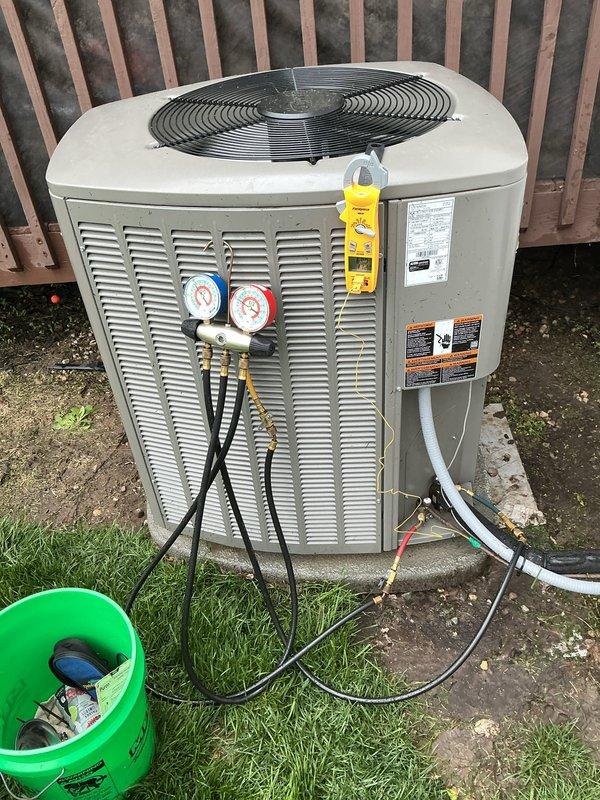 Performed routine air conditioning maintenance on outdoor condenser unit. Connected manifold gauges to assess system pressures and verify proper refrigerant charge levels. Conducted standard ACM preventive maintenance procedures to ensure optimal system performance and efficiency.
