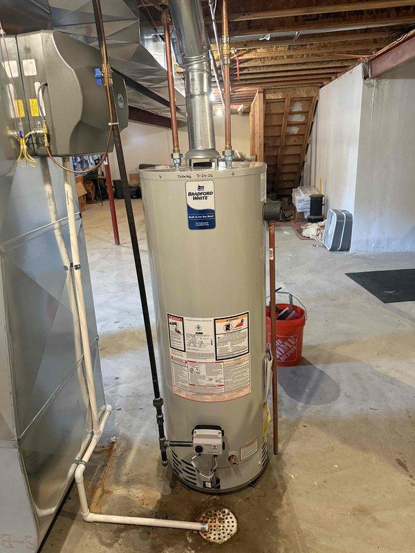 Successfully installed a 40-gallon tanked water heater in basement utility area. Connected copper supply lines and installed proper venting system with galvanized ductwork to ensure safe exhaust operation. Permits were obtained prior to installation to ensure compliance with local plumbing codes and regulations.