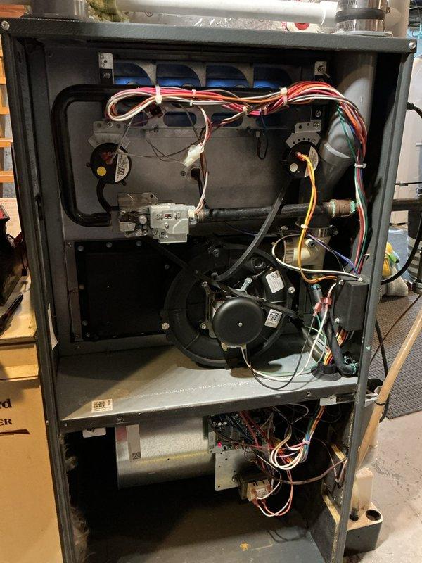 # Service Report: No Heat Call - 8-Year-Old Furnace Responded to a no heat call for an eight-year-old furnace that was completely non-operational with no ignition occurring. Upon arrival, conducted a thorough diagnostic inspection of the unit with the front panel removed to access internal components. Examined the gas valve assembly, ignition system, flame sensor, pressure switches, and control board for proper operation and electrical continuity. Inspected the inducer motor, blower motor assemblies, and all associated wiring connections for signs of failure or loose connections. Verified proper gas supply to the unit and checked all safety switches in the ignition sequence. Documented the internal condition of the furnace with photographs showing the wiring configuration, dual blower motors, gas valve assembly, heat exchanger, and control board. All findings and corrective actions were recorded for warranty tracking purposes, as the unit remains under the manufacturer's coverage peri
